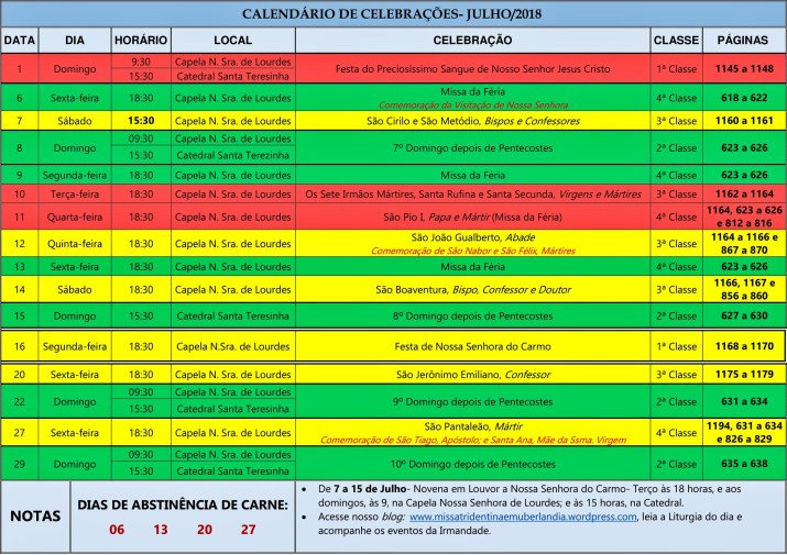 Compartilhamos o Calendário das Celebrações da Irmandade do Carmo, excepcionalmente apenas para este mês de Julho. Confira: