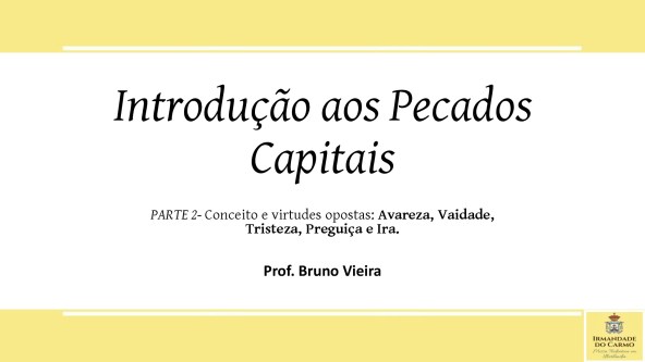 Slide- Introdução aos Pecados Capitais- 2ª parte por Diretoria de Comunicação30 de setembro de 2018Deixe um comentário Compartilhamos o slide, material-base, da aula de formação ocorrida no último sábado (29), na Sede da Irmandade do Carmo, que concluiu a análise introdutória dos Pecados Capitais. Clique na imagem e confira: Compartilhe: Clique para compartilhar no Facebook(abre em nova janela) Facebook Clique para compartilhar no X(abre em nova janela) 18+ Clique para compartilhar no WhatsApp(abre em nova janela) WhatsApp Clique para compartilhar no Telegram(abre em nova janela) Telegram Clique para compartilhar no LinkedIn(abre em nova janela) LinkedIn Clique para compartilhar no Tumblr(abre em nova janela) Tumblr Clique para compartilhar no Pocket(abre em nova janela) Pocket Clique para compartilhar no Pinterest(abre em nova janela) Pinterest Clique para compartilhar no Reddit(abre em nova janela) Reddit Clique para imprimir(abre em nova janela) Imprimir Clique para enviar um link por e-mail para um amigo(abre em nova janela) E-mail Curtir Carregando... Relacionado