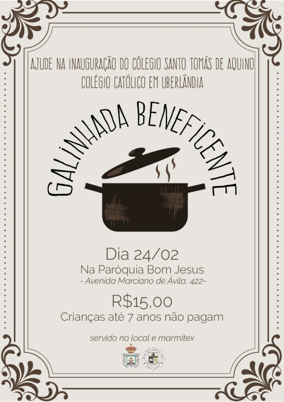 A Irmandade do Carmo promoverá uma Galinhada beneficente para arrecadar fundos para a inauguração do Colégio Santo Tomás de Aquino, nosso Projeto de Educação Católica para Uberlândia (conheça-o clicando aqui).