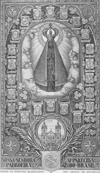 É sob o título de : Virgem Imaculada, que a Nação Brasileira invoca a sua excelsa Padroeira (Oração). A Mãe de Deus benignamente acolhe-nos debaixo de seu manto protetor, e seguros alcançaremos uma eternidade feliz..