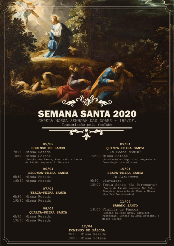 O canal da Missa Tridentina em Brasília, que acompanha as atividades do Instituto Bom Pastor na capital brasileira, transmite ao vivo a Santa Missa todos os dias, em vários horários, há algum tempo. Na Semana Santa, não será diferente. Através de seu canal no youtube (link abaixo) serão transmitidas todas as cerimônias para os interessados.