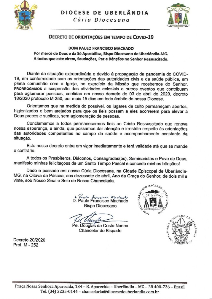 Nesta data, foi publicado novo Decreto do senhor Bispo de Uberlândia (cópia no fim do post), no qual reafirma as medidas já trazidas no anterior, bem como prorroga, por mais 15 dias, a suspensão de Missas e celebrações públicas.
