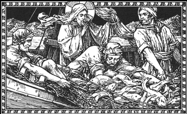 Sequéntia sancti Evangélii secúndum Lucam. In illo témpore: Cum turbæ irrúerent in Iesum, ut audírent verbum Dei, et ipse stabat secus stagnum Genésareth. Et vidit duas naves stantes secus stagnum: piscatóres autem descénderant et lavábant rétia. Ascéndens autem in unam navim, quæ erat Simónis, rogávit eum a terra redúcere pusíllum. Et sedens docébat de navícula turbas. Ut cessávit autem loqui, dixit ad Simónem: Duc in altum, et laxáte rétia vestra in captúram. Et respóndens Simon, dixit illi: Præcéptor, per totam noctem laborántes, nihil cépimus: in verbo autem tuo laxábo rete. Et cum hoc fecíssent, conclusérunt píscium multitúdinem copiósam: rumpebátur autem rete eórum. Et annuérunt sóciis, qui erant in ália navi, ut venírent et adiuvárent eos. Et venérunt, et implevérunt ambas navículas, ita ut pæne mergeréntur. Quod cum vidéret Simon Petrus, prócidit ad génua Iesu, dicens: Exi a me, quia homo peccátor sum, Dómine. Stupor enim circumdéderat eum et omnes, qui cum illo erant, in captúra píscium, quam céperant: simíliter autem Iacóbum et Ioánnem, fílios Zebedǽi, qui erant sócii Simónis. Et ait ad Simónem Iesus: Noli timére: ex hoc iam hómines eris cápiens. Et subdúctis ad terram návibus, relictis ómnibus, secuti sunt eum. — CREDO… |