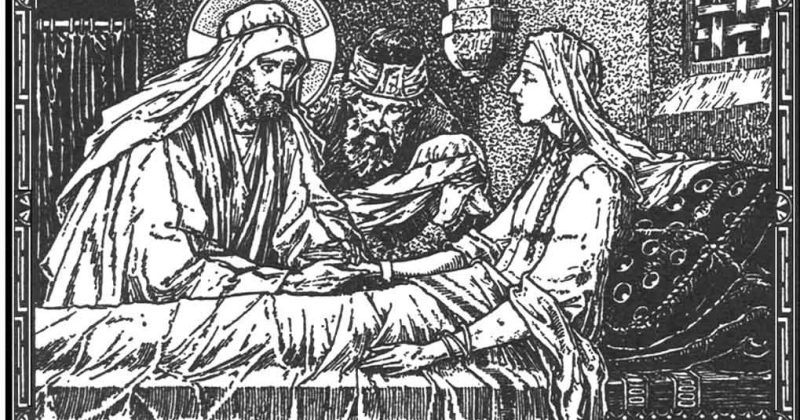 Sequéntia sancti Evangélii secúndum Matthaeum. In illo témpore: Loquénte Jesu ad turbas, ecce princeps unus accéssit, et adorábat eum, dicens: Dómine, fília mea modo defúncta est: sed veni, impone manum tuam super eam, et vivet. Et surgens Jesus sequebátur eum, et discípuli ejus. Et ecce múlier, quæ sánguinis fluxum patiebátur duódecim annis, accéssit retro, et tétigit fímbriam vestiménti ejus. Dicebat enim intrea se: Si tetígero tantum vestiméntum ejus, salva ero. At Jesus convérsus, et vídens eam, dixit: “Confíde, fília, fides tua te salvam fecit. Et salva facta est múlier ex illis hora.” Et cum venísset Jesus in domum príncipis, et vidísset tibícines, et turbam, tumultuántem dicébat: “Recédite, non est enim mórtua puélla, sed dormit.” Et deridébant eum. Et cum ejécta esset turba, intrávit, et ténuit manum ejus. Et surréxit puella. Et éxiit fama hæc in univérsam terram illam. — CREDO… |