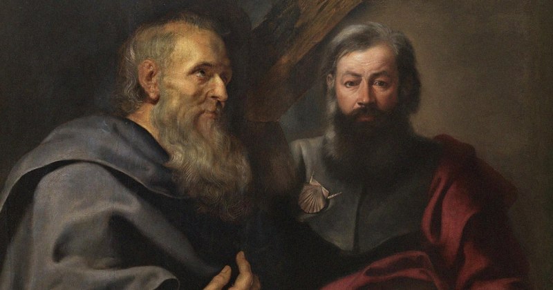 Entre a cruz e a espada que os martirizou, um segura as chaves do poder, o outro rolos das suas epístolas. Com as suas mãos unidas, ambos sustentam a Igreja fundada sobre eles, em que Cristo, inquebrável pedra angular, une os pagãos evangelizados por Paulo aos Judeus convertidos por Pedro.