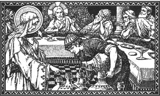 Naquele tempo, celebravam-se bodas em Caná da Galileia, e achava-se ali a mãe de Jesus. Também foram convidados Jesus e os seus discípulos. Como viesse a faltar vinho, a mãe de Jesus disse-lhe: Eles já não têm vinho. Respondeu-lhe Jesus: Mulher, isso compete a nós? Minha hora ainda não chegou. Disse, então, sua mãe aos serventes: Fazei o que ele vos disser. Ora, achavam-se ali seis talhas de pedra para as purificações dos judeus, que continham cada qual duas ou três medidas. Jesus ordena-lhes: Enchei as talhas de água. Eles encheram-nas até em cima. Tirai agora , disse-lhes Jesus, e levai ao chefe dos serventes. E levaram. Logo que o chefe dos serventes provou da água tornada vinho, não sabendo de onde era (se bem que o soubessem os serventes, pois tinham tirado a água), chamou o noivo e disse-lhe: É costume servir primeiro o vinho bom e, depois, quando os convidados já estão quase embriagados, servir o menos bom. Mas tu guardaste o vinho melhor até agora. .Este foi o primeiro milagre de Jesus; realizou-o em Caná da Galileia. Manifestou a sua glória, e os seus discípulos creram nele.