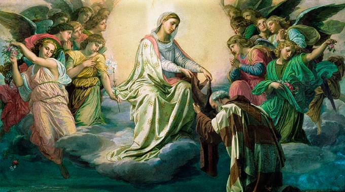 Em 16 de julho de 1251, a Santíssima Virgem apareceu a São Simão Stock, geral da Ordem, e prometeu uma benção especial, não somente para seus religiosos, mas também para todos aqueles que trouxessem o hábito da sua Ordem. Numerosos privilégios especiais foram concedidos pelos papas aos que trazem o escapulário e fazem parte da confraria de Nossa Senhora do Carmo. Instituída pelos carmelitas em 1332, a festa de Nossa Senhora do Carmo foi estendida a toda a Igreja por Bento XIII, em 1726.